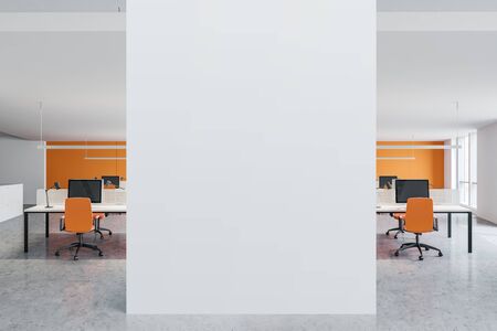 Interior of stylish open space office with bright orange and white walls, rows of computer tables and mock up wall in the center. 3d rendering