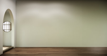 3d render of modern empty room with wooden floor and large plain wall on sea background.