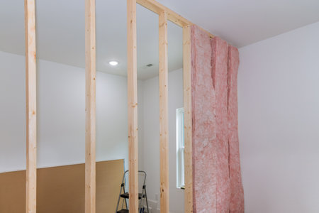 Wooden frame for future walls with drywall plates insulated with rock wool and fiberglass insulation staff for cold barrier. Comfortable warm home, economy, construction and renovation concept.