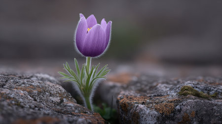 Purple blossom and green leaves pushing through a crack in dark asphalt pavement, symbolizing hope, perseverance, and strong natural growth in urban environment