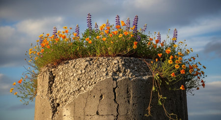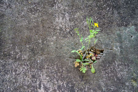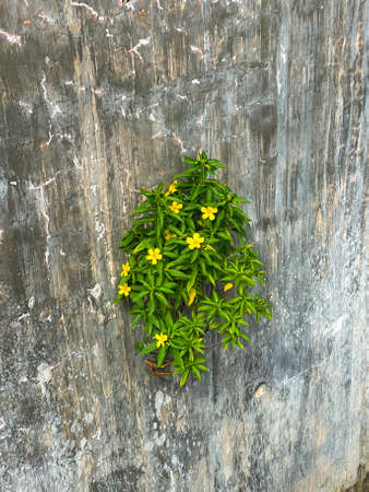 Yellow flowers growing on a vertical concrete wall. High quality photo