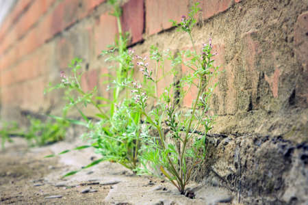 Pale orange wall, with grass grown. Asphalt wall of grass. Texture background pattern. The struggle for life