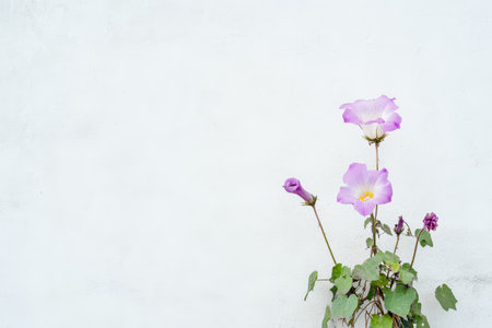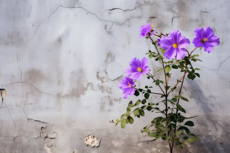 Vibrant purple flowers and buds grow against a plain white wall basking in bright daylight showcasing their natural beauty and freshness.
