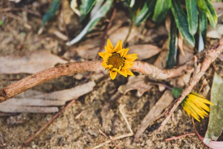 yellow gazania daisies surrounded by leaves and branches shot at shallow depth of field