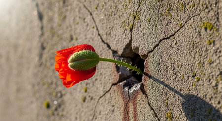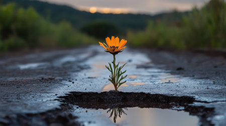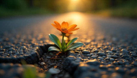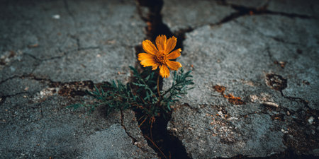 Orange flower growing from cracked asphalt, symbolizing resilience