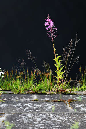 single beautiful pink willow-tea flower or a blooming Sally grows on a rock. Medicinal plant Ivan-tea on the background of dark water in the river