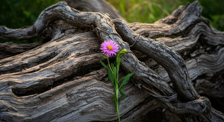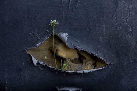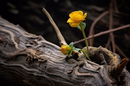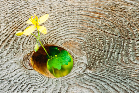 Delicate yellow flower growing through knothole in thick wooden board with rough wood texture