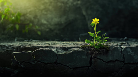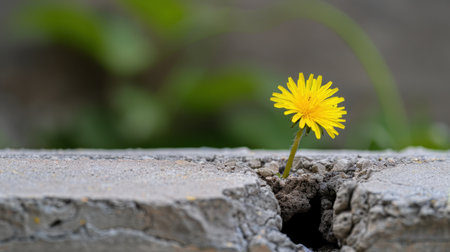 A bright yellow bloom persists amid urban decay, symbolizing hope and strength as it emerges through a narrow crevice in weathered concrete.