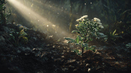 A cinematic wide shot of a young Chrysanthemum growing, slightly larger than before, its trunk and branches beginning to take shape, surrounded by rich, dark soil and faint morning mist, golden sunlight breaking through the clouds, soft beams illuminating the growing plant, ultra-realistic photography with true Earth like realism natural hues, no artificial colors, cinematic composition, deep 3D parallax depth creating an immersive, awe inspiring atmosphere, subtle natural lens flares, minimal 35mm film grain, tranquil and hopeful tone, 8K, highly detailed.