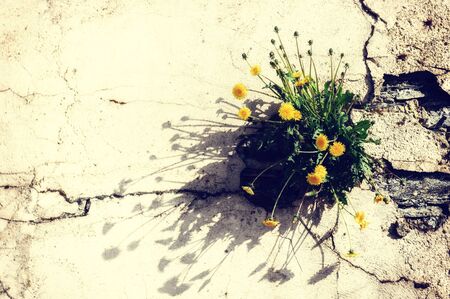 Wild yellow dandelion flowers growing in cracked concrete structure