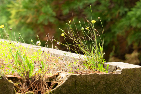 Lonely meadow Pippau grows on masonry with yellow flowers