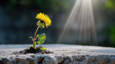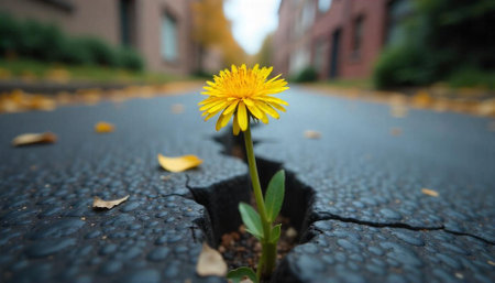 Dandelion growing through crack in asphalt, symbolizing resilience