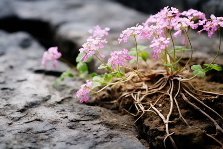 A close-up view of two vibrant pink flowers with dark centers growing from a textured, aged stone surface, showcasing resilience and natural beauty.