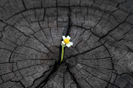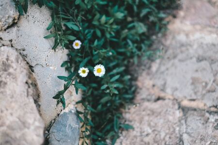 White daisy flower in the crack of an old stone slab - the concept of rebirth, faith, hope, new life, eternal soul
