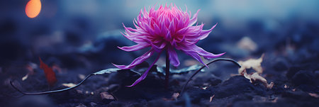 lonely little flower violet on old gray wooden board closeup. Selective focus, shallow depth of field. Copy space. Free space for text