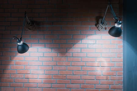 Brickwall backdrop with the tungsten lights from spotlight for Art Exhibition or vintage classic display product background.