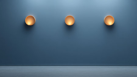 A serene interior scene featuring minimalist design with round wall lights casting a warm glow on a soothing blue wall, ideal for creating an inviting atmosphere.