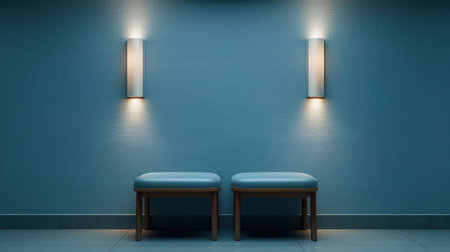 A serene interior space featuring two modern benches complemented by soft wall lights. The calming blue palette evokes relaxation, making it ideal for peaceful reflection.