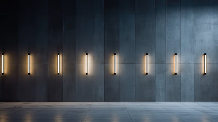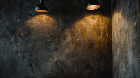 Textured dark industrial wall illuminated by warm spotlights, creating a moody and dramatic atmosphere. Ideal for backgrounds and design concepts.