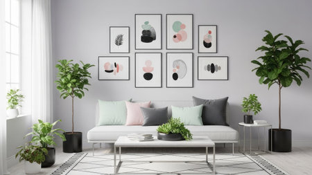 A bright and cozy living room featuring modern furniture and soft pastel colors. The space includes comfortable seating, decorative pillows, and artistic wall decor, creating a relaxing and inviting atmosphere, enhanced by indoor plants and stylish light fixtures.