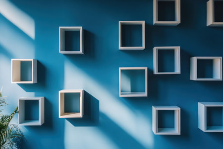 A blue wall with multiple boxes and square white frames on it, with several open box doors in the bottom right corner of each frame. The overall style is minimalistic and realistic. --ar 3:2 --v 6.1 Job ID: b9373c11-7d2c-4335-ab9a-97e909a40af5