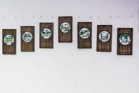 Wooden poster on the wall of historic buildings in Zhujiajiao, an ancient water town in Shanghai, built during Ming and Qing Dynasties of China