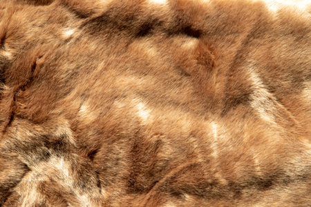 Real deer skin. Nature animal body patterns close-up. Redhead brown fur background, fur pile texture. Selective focus. Copy space.