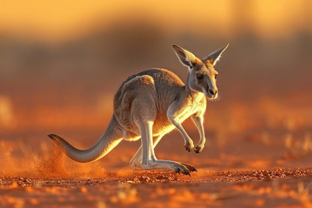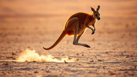Australian kangaroo leaping across a dusty plain at golden hour, outback wildlife