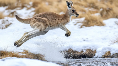 A kangaroo gracefully leaps over a snowy riverbank, showcasing agility and beauty in a winter landscape, surrounded by dry grass and tranquil scenery.