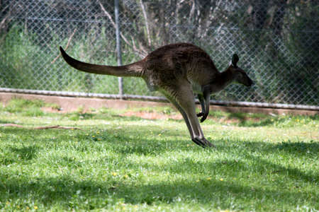 Kangaroo jumping in the Australian bush. This marsupial has the scientific name Macropus giganteus.