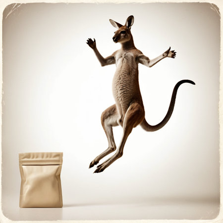 A kangaroo joyfully jumps in the air beside an unknown bag, showing its playful spirit.