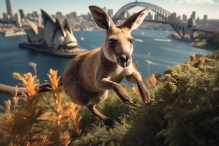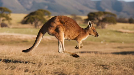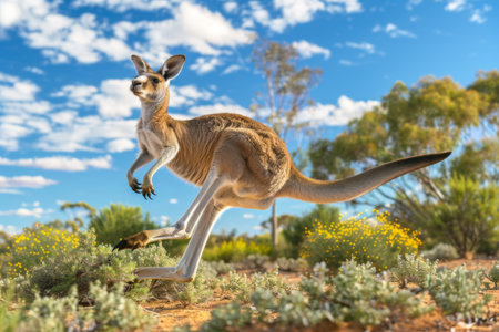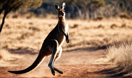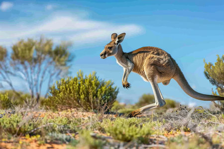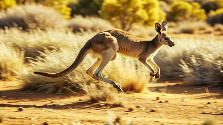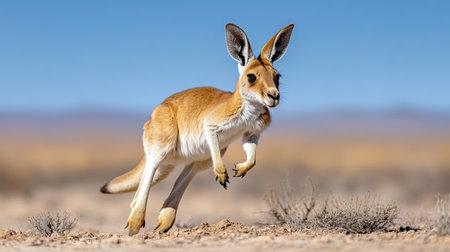 A kangaroo hopping in sunny desert landscape, showcasing its agility and grace