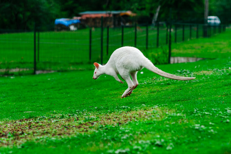 Australian red-necked albino wallaby eating pine tree needles in park. Albino variation of Bennett's wallaby.