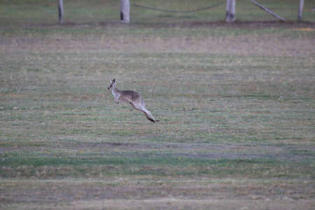 Pan shot of a Western Grey Kangaroo jumping in the grass