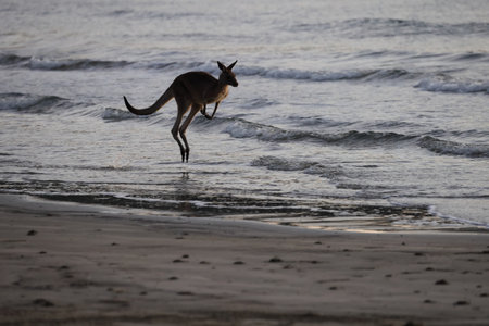 Kangaroo jumping on the beach at Cape Hillsborough, Queensland, Australia.