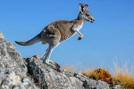 Kangaroo perched atop rocky outcrop in graceful stance, A kangaroo leaping gracefully over a rocky outcrop