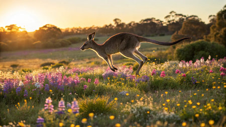 A kangaroo leaps gracefully across a golden grassland during sunrise. The warm light bathes the landscape, creating a serene and picturesque setting in nature.