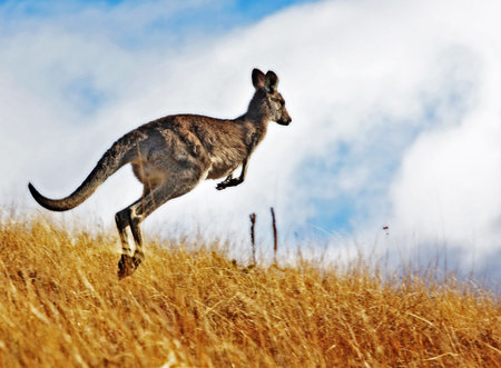 Capture the dynamic movement of a kangaroo hopping through the Australian outback
