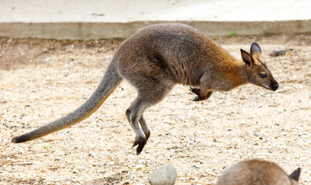 Wallaby drinking water from a concrete basin in Belgrade zoo. Side view portrait