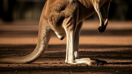 A close-up shot focusing on the powerful legs, tail, and lower body of a kangaroo standing on reddish earth. The sunlight highlights the texture of the fur and the animal's strong stance in its natural habitat.