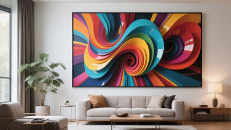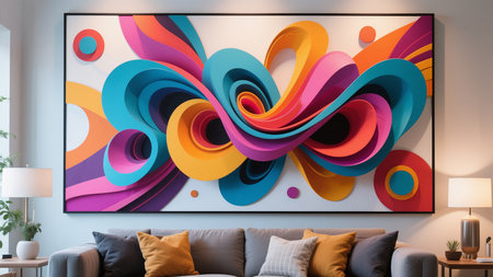 A modern living room featuring a grey sofa and lamps with a large, colorful abstract art piece on the wall. The artwork is bright and adds a contemporary touch to the room.