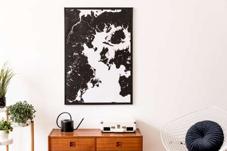 Stylish and retro composition of living room with design wooden vintage commode, armchair, a lot of plants and elegant accessories. Modern home decor. Template. Mock up poster frame on the wall.