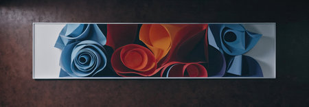 painting on the wall with abstract flowers stylized as paper, pale muted colors