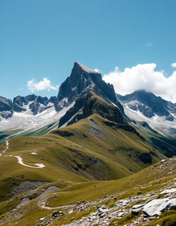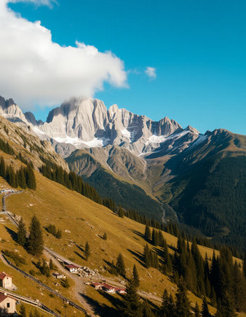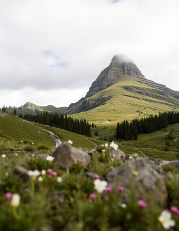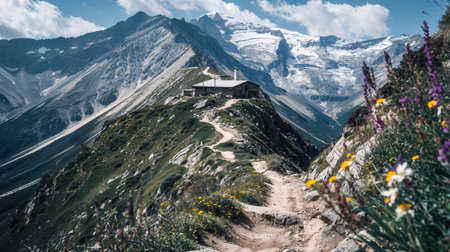 Scenic view of a winding path leading to a hut nestled amidst the breathtaking alpine landscape, with wildflowers adding a touch of color
