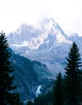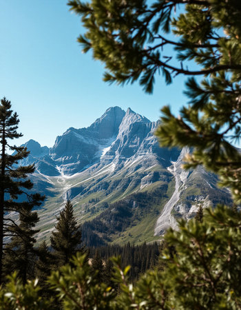 Mountain landscape with snow-capped peaks and coniferous forest