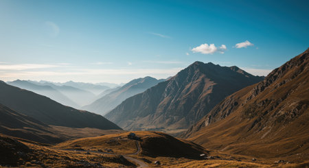 Captivating mountain landscape showcasing rolling hills under a clear blue sky. The serene atmosphere invites exploration and appreciation of nature's beauty.