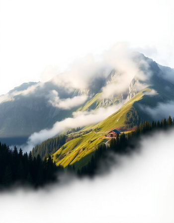 Beautiful alpine landscape with a mountain house in the clouds.