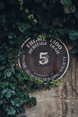 Frome, UK - October 07, 2020: Number 5 heritage trail plaque on a wall of a building in Frome. The Heritage Trail focuses on the architectural and industrial heritage of Frome.