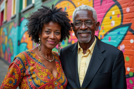 Elderly african couple smiling in colorful urban setting with vibrant mural background.