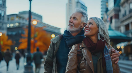 An elegant elderly couple stands together in a beautiful setting, smiling warmly